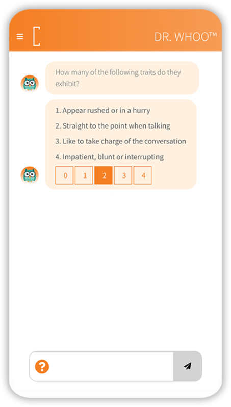 Dr. Whoo is the integrated Personal HR advisor accessible to all employees. In case of a new staff member joining the team or in case of conflict or an upcoming meeting with an existing co-worker, Dr. Whoo will guide you and tell you exactly what the best practices of communicating and interacting with that individual are.